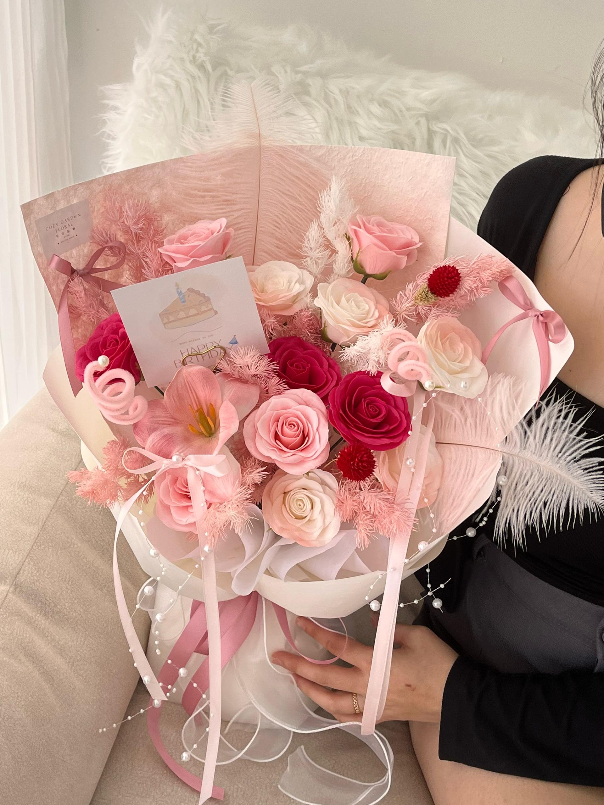 Celebrate timeless beauty and everlasting love with our Forever Bloom bouquet. This exquisite arrangement features a delicate blend of preserved roses in shades of blush pink, creamy white