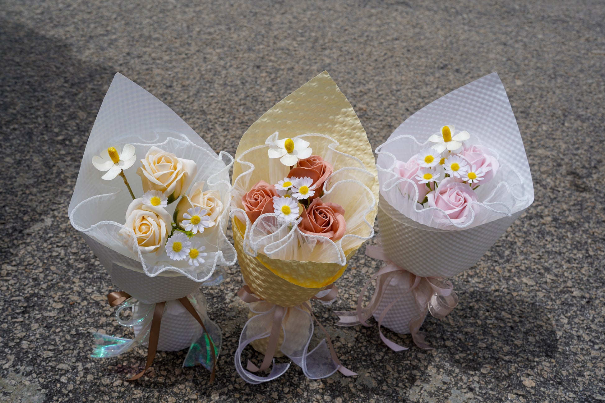 ✨ Packaging: Wrapped in textured pastel paper with tulle and satin bows